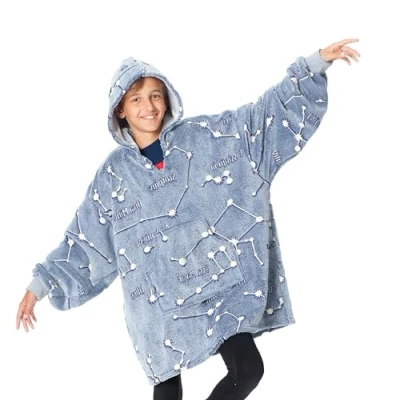 KANGURONE is a sweatshirt, wearable, with hood, ideal to stay warm and have total freedom of movement. Incredibly fluffy, the new hoodies give maximum softness combined with the quality guaranteed by Kanguru HOODIE WEARABLE BLANKET: Blanket with hood, worn like a fleece with CONSTELLATIONS pattern. The size 75 x 75 cm makes it suitable for Kids. Once worn, it will keep us warm and allow us to move freely around the house. Blue color, elegant and always easy to match. Ideal for studying, reading, working, drinking tea but especially for playing and watching TV. GLOW IN THE DARK EFFECT: absorbs light during the day and glows in the dark. GIFT IDEA: Kangurone Glow is the best choice for a gift, ideal for a niece, for a friend, for a classmate for Christmas, Birthday, or other occasions. Who receives Kanguru, will always react a great smile DETAILS THAT MAKE THE DIFFERENCE: made of 100% soft premium microfibre fleece called flannel; the super soft and pleasant material has a soft and delicate effect, anti-allergic, does not irritate the skin, ideal for children or those with delicate skin PREMIUM QUALITY: kanguru blankets are made with extreme attention to detail and with the softest of the fleece (flannel), oekotex certified, and kanguru is machine washable, will not lose colour or fluff; wash cycle before use is recommended