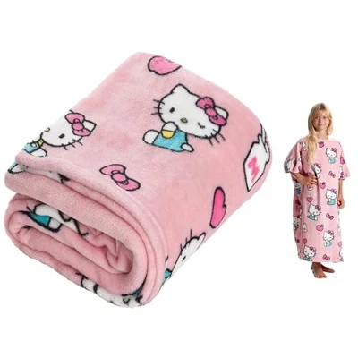 OFFICIAL HELLO KITTY CHARM: Immerse your child in the world of Hello Kitty with this adorable wearable blanket! Featuring authentic graphics of everyone's favourite character, it's the perfect cute blanket for any Hello Kitty fan. A fantastic addition to their Hello Kitty stuff collection. ULTIMATE SNUGGLE COMFORT: Crafted from super-soft, Oeko-Tex certified fleece, this Hello Kitty blanket provides unparalleled warmth and coziness. It’s an oversized snuggle solution designed for maximum comfort while lounging, reading, or playing. FREEDOM TO PLAY: Designed for kids aged 4-12 years, this innovative wearable blanket offers full arm movement, letting children stay warm without restriction. It’s a versatile alternative to traditional kids blankets, promoting comfort and fun. THE PERFECT HELLO KITTY GIFT: Searching for the best Hello Kitty gifts for girls? Look no further! This Hello Kitty wearable blanket is an ideal present for birthdays, Christmas, or any special occasion, sure to delight any young fan EASY CARE & VERSATILE: Measuring 80 x 90 cm (approx. 31.5 x 35.4 inches), this durable fleece is machine washable for simple care. Perfect for relaxing on the sofa, as a kids blanket for sleepovers, or for adding Hello Kitty comfort during travel.