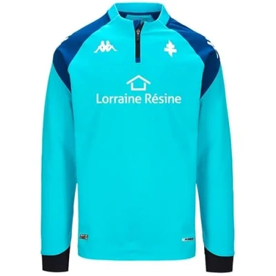 ABLAS PRO 7 FC METZ SWEATSHIRT 23/24 BLUE MEN Kombat Pro training sweatshirt for men. Fit slim. Round neck, long sleeves, 1/4 zipper opening at front neck. Inserts on the sleeves, edge with an elastic band. Insertion of a colored band on the sides creating a contrast. Omini logos applied by thermal transfer on the chest, on the back, on the neck, on the hips. FC Metz logo printed in HD on the chest. 108% polyester, 9% elastane. Machine wash at 30°