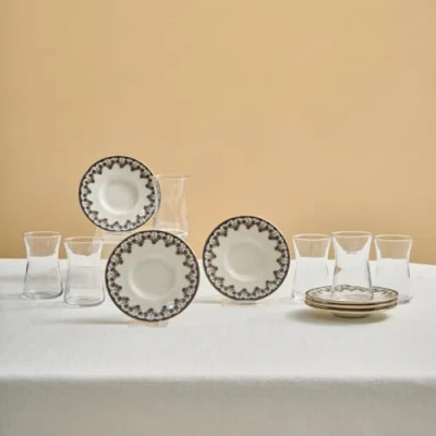 Complete Tea Set: The Turkish tea cup set includes 6 tea glasses (170ml), 6 matching saucers, and 6 tea spoons, providing a complete tea experience. Elegant Detailing: The saucers features intricate blue and gold accents with floral patterns, creating a sophisticated look that complements any table setting. Porcelain Material: The six matching saucers are both durable and refined, made from porcelain, offering a sleek, classic look while ensuring a lasting and sophisticated presentation. Care Instructions: For longevity, hand wash is recommended to maintain the pristine quality and vibrant colors of the set. Gift-Ready: This tea set makes an ideal gift for tea enthusiasts, newlyweds, or housewarmings. Its timeless design and premium quality ensure it will be cherished for years to come.