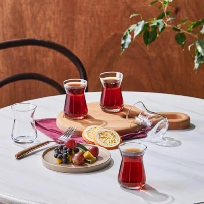 Complete Set of 6: This set includes 6 elegant tea glasses, ideal for serving traditional Turkish tea or any hot beverage to your guests or family. Sophisticated Irem Design: Features a stylish, intricate design that adds a refined touch to your tea time, perfect for both casual and formal occasions. High-Quality Glass Construction: Made from durable glass, these tea glasses are designed for long-lasting use, providing excellent clarity and an enhanced tea-drinking experience. Dishwasher Safe: The set is easy to maintain as it is dishwasher safe, allowing for effortless cleaning after every use.