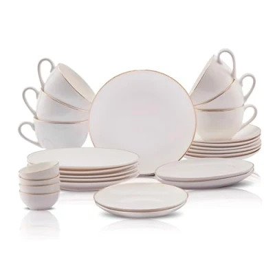 Complete Set for 6: Immerse yourself in the most lavish dining experience possible with 6 generously sized dessert plates (21 cm, 8.2”), 6 cheese plates (15.5 cm, 6.1"), 6 oliver plates (17.8 cm, 7."), 6 tea cup and tea saucers. Designed for 6 diners, our dinner set is perfect for family gatherings and special occasions. New Generation Bone: Our serveware set for 6 is made from New Generation Bone, a raw material crafted by adding artificial bone ash and calcium carbonate to the porcelain used. The combination found in New Generation Bone lends an elegant touch to the cream-colored porcelain. Healthy & Easy Maintenance: Cleaning becomes a breeze with the Marcelo Gold serveware set. Our breakfast set designed for 6 people ensures a healthy and hygienic dining experience on account of the waterproof properties of the materials used. However, it's important to note that the white dinner set is not dishwasher-safe due to the delicate composition of certain items. Microwave and Oven Use: The sets with gold or platinum decoration should not be used in the microwave or oven to prevent potential damage or breakage. Lead-Free and Safe: Free from heavy metals including lead, our serveware set places your health and safety at the forefront of all considerations, allowing you to savour your meals with confidence and peace of mind., Weight: 13.22773572 Pounds, Manufacturer: KARACA