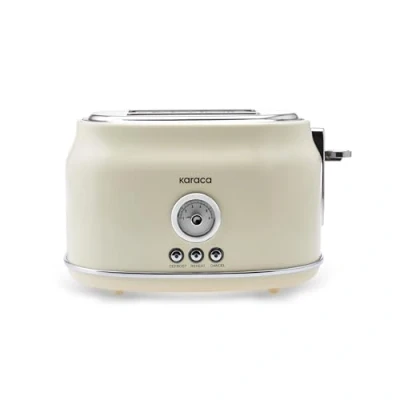 Elegant Retro Design: Featuring a soft cream finish with stainless steel details, this retro toaster adds vintage character to your kitchen while delivering reliable everyday performance. 2 Slice Toaster: Designed to toast two slices at once, the automatic bread centering system helps ensure even browning on both sides. 6 Adjustable Browning Levels: Adjust between six browning levels to use this bread toaster just the way you like your bread, from lightly golden to crisp. Defrost, Reheat & Cancel Functions: This compact toaster includes dedicated controls for defrosting frozen bread, reheating toast, and canceling the cycle for added convenience. Removable Crumb Tray & Cord Storage: Includes a slide-out crumb tray for easy cleaning and a built-in cord storage compartment to keep your countertop neat and organized., Manufacturer: KARACA