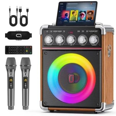 Karaoke Machine with 2 Wireless Microphones Bluetooth 5.3 Speaker Bass/Treble/Echo Adjustment PA System Remote Control & RGB Lights, Supports TV/TF Card/USB/AUX/Live/REC for Home Parties