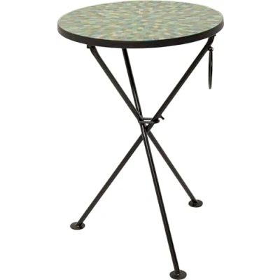 Artistic tabletop: Round side table measuring 53 x 35 x 35 cm with a striking mosaic glass surface in green and blue that shimmers beautifully depending on the light Stable frame: Black foldable steel base creates a strong contrast to the colorful mosaic while ensuring durability and reliable stability in everyday use Flexible placement: Functions as a stylish coffee table next to the sofa a compact storage option in the hallway or an extravagant bedside table in the bedroom Practical design: Foldable construction allows the table to be quickly set up or stored away providing maximum flexibility and space saving convenience Decorative accent: Combines artistic craftsmanship with functional use bringing color texture and a sophisticated touch to any living space