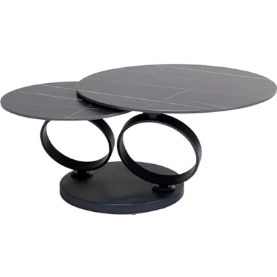 Elegant Design: Luxury Ambience – This coffee table brings a luxury atmosphere to your home with its upmarket style, featuring a sleek matt black finish and sophisticated design elements Swivel Function: Adjustable Table Tops – The larger table top can be fully swiveled over the smaller one or outwards, offering a practical and adaptable solution for easy access to drinks, snacks, and remotes Premium Materials: Ceramic Table Tops – Crafted from high-quality ceramic with a natural stone-look grain, the table tops add both durability and elegance, ensuring long-lasting performance and style Unique Base: Sturdy and Eye-Catching – The round base and two ring-shaped steel frames are exquisitely powder-coated in matt black, providing a stable foundation while contributing to the table's striking visual appeal Versatile Use: Perfect for Any Space – Whether next to a corner sofa or couch, this stylish coffee table adapts to your needs, combining practical functionality with a touch of grandeur to enhance any living room