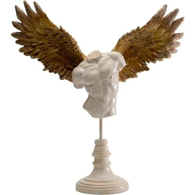 Elegant Design: White and gold male torso sculpture with wings, combining antique style with modern aesthetics to create a striking statement piece in your home Premium Material: Crafted from durable polyresin and hand-painted, ensuring a high-quality finish with each sculpture being a unique work of art Handcrafted Uniqueness: Each piece is handmade, making it a one-of-a-kind decoration that adds personality and charm to your living room or dining area Greek Antiquity Inspiration: Featuring a male torso in a marble-look finish with large golden wings, this sculpture brings the timeless elegance of Greek antiquity into your space Sophisticated Home Accent: Perfect for adding a touch of ancient allure and sophistication to any room, making it an ideal choice for those who appreciate unique, artistic home decor