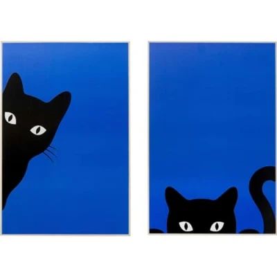 Cat Picture Set: Set of 2 cat pictures in blue and black (60 x 40 x 3 cm each) designed to bring a modern and stylish touch to any room Elegant Design: The deep, slim frame in light-colored wood complements the contemporary aesthetic, enhancing the overall look of your home décor High-Quality Print: Printed on premium art paper, these cat-themed pictures showcase vivid colors and striking detail for long-lasting visual appeal Versatile Display: Perfect for hanging as a pair or separately, these charming cat pictures add a playful yet sophisticated vibe to walls or bookshelves Sleek Finish: The back of each picture is covered in black foil, giving a clean, professional appearance while ensuring easy mounting on your wall