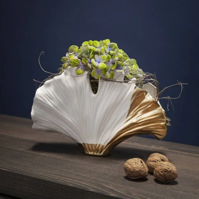 Ginkgo Elegance vase made of glazed stoneware This artistic ceramic vase in the unique shape of a ginkgo leaf is a special eye-catcher. The white ceramic of the glazed vase is enhanced by gold-coloured details, giving it an elegant and luxurious look and making it a sophisticated eye-catcher. The vase is made from glazed stoneware that has been fired at a temperature of 1200 °C.