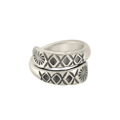 SilverlyAdorn yourself with the Karen Hill Tribe Silver Engraved Flower Motif Ring. This wraparound ring showcases an intricate floral design, reflecting the beauty of artisan craftsmanship and nature-inspired design.. 999 fine silver overlapping ring with an engraved tribal motif.. Width 12.3 mm.. These handmade rings are made by the Karen hill tribe and because they are rather chunky, they also look great as thumb rings.. Our Karen Hill Tribe jewellery for women is all handmade with pure silver (99.9%). Thai pure silver, unlike sterling silver (92.5%) has a more matte finish and its shine is softer - it also takes longer to tarnish than sterling silver as it's mixed with a lower percentage of other base metals which speed up this process.