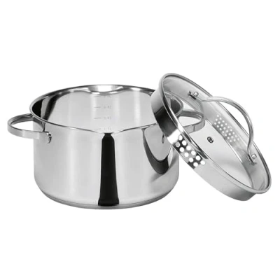 Made of stainless steel Inside and outside high-gloss polished, inside with liter scale Crimped edge with two opposite spouts Glass cover 4 mm with steam hole and extended openings Suitable for all types of cookers, also for induction cooking ranges