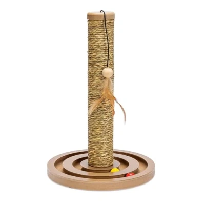 Colour: Beige Base material: MDF Material of scratchers: Cardboard and algae Dimensions: 30 x 44 cm (diameter x height) Ball track, with two balls, placed in the base