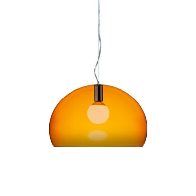 The modern FL/Y pendant lamp, designed by Ferruccio Laviani, shown here in orange, is definitely a feast for the eyes above the dining table. With its simple, almost hemispherical design, the FL/Y pendant lamp adds fresh yet stylish accents in eleven different colour variations. Thanks to the use of versatile polycarbonate material, these range from bold red, yellow and orange tones to subtle blue and green. The fantastic FL/Y collects the light and emits it downwards without glare, while the coloured lampshade (in the transparent versions) casts a wonderful play of light upwards. To the imaginative observer, the FL/Y floats in the room like a dazzling soap bubble, enchanting with its iridescent reflections. If a more neutral lighting effect is desired, the two opaque versions are available in black and white, which eliminate the coloured light component. Please note: Kartell recommends installing the light and only then removing the protective film, as this is an easy way to avoid damage from scratches on the surface of the light. See more in our demonstration video. Version: 9030K4 Available in the following colours Transparent K1/Petroleum K2/Light blue K3/Red K4/Orange K5/Cobalt blue K6/Yellow K7/Cardinal red K8/Emerald green K9/Sage Matt 03/White 09/Black