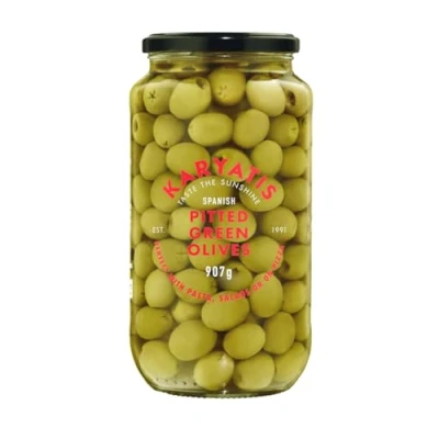 Karyatis Spanish Green Pitted Olives in Brine, Glass Jar, 907g
