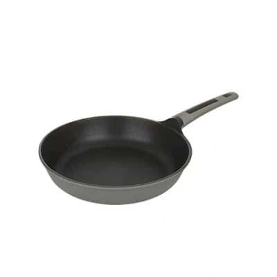 Nonstick frying pan with aluminum body for quick and even heat distribution from floor to walls Sleek grey design with silicone inserts on handle for firm grip Base for all hobs, including induction hobs