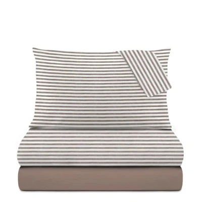 Wyndham is the bed collection with a striped pattern in beautiful trendy colours! Made from cotton, the bed set is soft and breathable, the ideal choice for a restful sleep. Thanks to the fine weave technique (30/27 - 57 threads/cm2), the perfect blend of comfort, strength and softness is created. Cotton is made exclusively from 100% natural fibres and breathable material that absorbs excess moisture and always provides you with an even temperature to rest. The double bed sheet set consists of: a plain brown fitted sheet (170 x 200 cm), combined with the flat sheet (240 x 290 cm) and the 2 matching pillowcases with brown striped pattern. Machine-washable at 30 °C