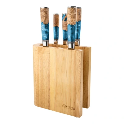 The Katana Saya Elements 6-Piece Knife Block Set Ocean is designed to bring professional-level performance and stunning aesthetics to any kitchen, all at an affordable price. This versatile set is perfect for both seasoned chefs and cooking enthusiasts who want high-quality tools without breaking the bank. The set includes five essential knives for a variety of kitchen tasks: a 20cm Chef’s Knife, 20cm Carving Knife, 20cm Bread Knife, 12cm Utility Knife, and 9cm Paring Knife. Together, these knives cover everything from slicing and dicing to carving and detailed prep work, making this set an invaluable addition to any kitchen. Each knife in the set is crafted from 67 layers of VG-10 Damascus steel, a premium material known for its outstanding durability, sharpness, and corrosion resistance. VG-10 steel is renowned for its high carbon content, which provides exceptional toughness and the ability to retain a sharp edge longer than many other steels. The Damascus cladding on the blades not only strengthens the knives but also adds a beautiful feathered pattern to each blade, creating a striking visual effect while enhancing the knife's functionality. With a Rockwell hardness rating of 60+, the blades offer exceptional edge retention and performance for all your culinary needs.The knives feature ergonomic handles made from a combination of olivewood and vibrant blue translucent resin. The natural beauty of olivewood, known for its grain and durability, is complemented by the striking blue resin, providing both a comfortable, secure grip and an eye-catching design. This unique combination of materials gives the knives a modern yet timeless look, adding a splash of color and vibrancy to your kitchen. The set is housed in a luxurious, light wood knife block that offers both protection and a sleek way to store the knives.The block keeps the blades organized and easily accessible, ensuring they remain in pristine condition. Whether you're a professional chef or a home cook, the Katana Saya Elements 6-Piece Knife Block Set Ocean offers superb performance, lasting durability, and a touch of elegance for your kitchen at an unbeatable value.