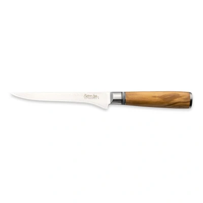 The Katana Saya 15cm Boning Knife from the Western Olive wood range is a specialized, essential tool for anyone serious about their cooking. This knife excels at filleting and boning both meat and fish with precision, making it a must-have for professional chefs and cooking enthusiasts alike. The 15cm blade is the ideal size for maneuvering around bones and delicate cuts of meat, allowing for clean and accurate separation. Its medium length provides a perfect balance of control and reach, enabling users to easily work through both smaller and larger cuts of meat or fish.The blade is crafted from 67 layers of VG-10 Damascus steel, a high-quality material known for its exceptional toughness and corrosion resistance. The VG-10 core, combined with the stainless steel cladding, offers outstanding durability and a sharp edge that retains its cutting power over time. With a Rockwell hardness rating of 60+, this boning knife holds its edge well, making it a reliable tool for frequent use in the kitchen. The intricate Damascus pattern on the blade not only adds to its aesthetic appeal but also reflects the meticulous craftsmanship involved in its creation. The 15cm Boning Knife's design ensures superior precision, making it ideal for tackling delicate tasks such as deboning fish or trimming meat. The sharp, flexible blade can easily navigate around bones and joints, ensuring clean cuts without tearing or damaging the meat. This high level of control allows users to achieve professional-quality results when preparing their dishes.The handle of the knife is made from Olive Olive wood, a durable and moisture-resistant material known for its ability to withstand the rigors of a busy kitchen. The handle provides a secure and comfortable grip, ensuring that the knife feels balanced and easy to control during use. The luxurious Olive finish of the Olive wood complements the elegant, layered Damascus pattern on the blade, making this knife not only highly functional but also visually striking.The Katana Saya Boning Knife comes with a protective leather sheath, ensuring the blade stays sharp and safe when not in use. The sheath also offers protection for the user, preventing accidental cuts. This knife makes an excellent addition to any kitchen, delivering high performance and a touch of elegance.