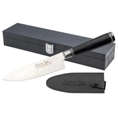 Amazon MarketplaceEXCEPTIONAL DESIGN: Masterfully crafted from Japanese 67-layer, VG-10 Damascus stainless steel with a sleek black Pakkawood handle, presented in a pakkawood box EXTREME TOUGHNESS: Constructed from 67-layers of the highest quality VG-10 Damascus steel, each Katana Saya knife has a high carbon content ensuring robust edge retention UNPARALLELED SHARPNESS: The Damascus steel blades offer exceptional sharpness for long lasting powerful cutting in the kitchen TOUCH OF ELEGANCE: Choose the sleek, black Pakkawood handle, with an ergonomic chestnut shape, for a soft and elegant design right at home THE CHEF'S KNIFE: An extremely versatile, all-purpose 15cm (5.9 in) chef's knife, widely used in kitchens all around the world