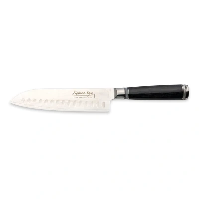 The Katana Saya Santoku Knife 18cm from the Eastern Pakkawood range is a high-performance knife designed for versatility in the kitchen. Santoku, which translates to "three ways" in Japanese, refers to a knife that excels in three key cutting functions: slicing, dicing, and chopping. The 18cm version of this knife offers an ideal size for those looking for a smaller yet highly efficient all-purpose tool. Whether you're preparing vegetables, meat, or fish, the Santoku knife’s fluted blade design ensures smooth cuts by preventing food from sticking to the blade, making food prep quicker and more efficient. The blade of the Katana Saya Santoku Knife is constructed with 67 layers of VG-10 Damascus steel, known for its outstanding durability and sharpness. The VG-10 core steel is combined with Damascus cladding to enhance the knife's strength while providing a beautiful layered pattern on the blade. With a Rockwell hardness of 60+, the blade retains its sharp edge longer and resists wear, ensuring that it will maintain its cutting power through numerous kitchen tasks.The high carbon content in the steel also improves the blade’s toughness, allowing it to handle heavy-duty cutting tasks with ease. The Santoku knife is equipped with a deep black Pakkawood handle, which offers both durability and comfort during use. Pakkawood is a robust material known for its resistance to moisture and wear, making it an excellent choice for kitchen tools. The handle's ergonomic design ensures a secure, comfortable grip, giving you control and precision while working with the knife. This knife comes in an attractive gift box, complete with a wooden ‘Saya’ sheath, offering protection for the blade when not in use. The ‘Saya’ sheath also protects users from the knife's sharp edge, ensuring safe storage.The combination of exquisite craftsmanship, premium materials, and functional design makes the Katana Saya Santoku Knife 18cm a valuable tool for both professional chefs and home cooks alike. With its beautiful Damascus blade, durable Pakkawood handle, and superior performance, this knife is an essential addition to any kitchen. The Katana Saya Eastern Pakkawood Santoku Knife delivers high-quality craftsmanship at an affordable price, offering a great balance of practicality and elegance.