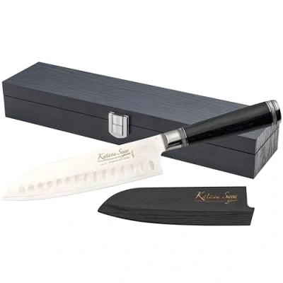 AmazonEXCEPTIONAL DESIGN: Masterfully crafted from Japanese 67-layer, VG-10 Damascus stainless steel with a sleek black Pakkawood handle, presented in a pakkawood box EXTREME TOUGHNESS: Constructed from 67-layers of the highest quality VG-10 Damascus steel, each Katana Saya knife has a high carbon content ensuring robust edge retention UNPARALLELED SHARPNESS: The Damascus steel blades offer exceptional sharpness for long lasting powerful cutting in the kitchen TOUCH OF ELEGANCE: Choose the sleek, black Pakkawood handle, with an ergonomic chestnut shape, for a soft and elegant design right at home THE SANTOKU KNIFE: This larger, all-purpose 18cm (7.1in) santoku knife is suitable for slicing, dicing and chopping all food types, with a fluted edge to prevent sticking