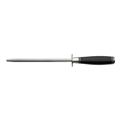 The Katana Saya Pakkawood Diamond Sharpener is a premium tool designed to keep all of your knives in excellent working condition. Whether you're using high-quality Japanese knives or ceramic blades, this sharpener is perfect for restoring sharpness and honing your edges to perfection. Regular sharpening ensures your knives stay razor-sharp, providing precision and ease in every cut. Ideal for both professional chefs and home cooks, this sharpener helps maintain optimal performance and prolongs the lifespan of your kitchen knives.Crafted with high-quality Japanese steel, the sharpener features a durable diamond coating that effectively sharpens and polishes all types of knives, including those with ceramic blades. The diamond surface ensures a precise sharpening experience, giving your knives the perfect edge for cutting, chopping, and slicing. Its versatility means it can be used on a wide range of kitchen knives, whether they're made of traditional carbon steel or more modern materials, providing an all-in-one sharpening solution.The sharpener is designed for ease of use and comfort. The handle is made from black Pakkawood, a tough and resilient material known for its sleek, polished finish and ergonomic feel. The addition of an opal effect ring at the end of the handle enhances its aesthetic appeal, providing a touch of elegance that complements the sharpener's high-end craftsmanship. The Pakkawood handle is not only visually appealing but also offers a secure, comfortable grip, even during extended use.The Katana Saya Diamond Sharpener is a practical and essential tool for keeping your knives in peak condition. It comes with a protective leather sheath to safeguard the sharpener when not in use and to ensure safe handling. For added convenience and presentation, it is housed in a beautiful wooden gift box, making it an excellent gift for anyone who appreciates quality kitchen tools.With the Katana Saya Pakkawood Diamond Sharpener, you can ensure that your knives remain as sharp as the day you bought them, helping you maintain precise, effortless cutting in the kitchen for years to come.
