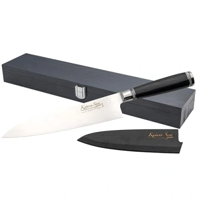AmazonEXCEPTIONAL DESIGN: Masterfully crafted from Japanese 67-layer, VG-10 Damascus stainless steel with a sleek black Pakkawood handle, presented in a pakkawood box EXTREME TOUGHNESS: Constructed from 67-layers of the highest quality VG-10 Damascus steel, each Katana Saya knife has a high carbon content ensuring robust edge retention UNPARALLELED SHARPNESS: The Damascus steel blades offer exceptional sharpness for long lasting powerful cutting in the kitchen TOUCH OF ELEGANCE: Choose the sleek, black Pakkawood handle, with an ergonomic chestnut shape, for a soft and elegant design right at home THE GYUTO KNIFE: Similar in shape to a Western chef's knife, this 20cm (7.9in) gyuto knife is extremely versatile, featuring a pointed tip helping to fillet meat and fish