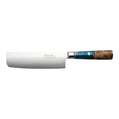 The Katana Saya Elements 18cm Nakiri Knife Ocean is a versatile and beautifully crafted tool designed to elevate your cooking experience, especially when it comes to chopping vegetables. Featuring a straight blade edge and squared tip profile, this Nakiri knife allows for precise cutting all the way down to the cutting board without the need for a horizontal push or pull. This design makes it especially useful for quick and efficient vegetable prep, delivering clean, uniform cuts every time. The 18cm blade length is considered medium-sized, offering a perfect balance between maneuverability and cutting surface area. The blade itself is made from the finest VG-10 core steel, a premium Japanese steel known for its durability and exceptional sharpness. With 67 layers of Damascus steel cladding, the blade combines the toughness of high-carbon steel with the corrosion resistance of stainless steel, ensuring the knife stays sharp and performs at its best for a long time. The VG-10 steel has a Rockwell hardness of 60+, which means it can hold an edge longer and provides superior strength, making this knife a reliable choice for both professional chefs and home cooks.The exquisite craftsmanship of the blade is reflected in the stunning feathered Damascus pattern, which not only enhances the knife's appearance but also adds an extra layer of durability. The beauty of the blade is complemented by the unique handle, made from a combination of olivewood and blue translucent resin. This ergonomic handle provides a comfortable grip while also adding a pop of color and style to your kitchen.Each knife in the Katana Saya Elements range comes in a gift box with a protective wooden 'Saya,' which helps shield the blade from damage and ensures safe handling. This makes it a perfect gift for culinary enthusiasts or anyone who appreciates high-quality kitchen tools.
