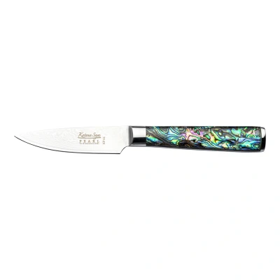 The Katana Saya Pearl Paring Knife (9cm) is a small but mighty tool that stands out in any kitchen. Despite its compact size, this knife is incredibly versatile and perfect for tackling those delicate tasks that larger knives can't handle. Whether you're peeling fruits, deveining shrimp, or making precise cuts on small vegetables, this 9cm blade provides the control and accuracy you need. It is ideal for intricate jobs like de-seeding, trimming, or even decorative garnishes.Crafted with VG-10 Damascus steel, this knife features 67 layers of premium steel, giving it remarkable toughness and edge retention. The VG-10 core is known for its ability to maintain sharpness over time, making the blade an excellent choice for precision work. With a HRC 60+ hardness rating, this paring knife cuts through even tough produce with ease, ensuring effortless and clean cuts every time. The Damascus cladding not only enhances the knife's strength but also creates a beautiful layered pattern along the blade, showcasing the exceptional craftsmanship involved in its creation.The blade is finished with an elegant, durable Pakkawood handle, which is designed for comfort and longevity. The deep black finish on the handle exudes a sense of luxury, while the ergonomic design ensures a comfortable, non-slip grip, even during long hours of food preparation. The Pakkawood material is moisture-resistant, adding durability and enhancing the overall strength of the handle.To ensure the knife’s longevity and sharpness, the Katana Saya Pearl Paring Knife comes with a protective leather sheath, offering safe storage when not in use. The sheath also helps prevent accidents and damage to the blade. This knife is part of the Western Pakkawood range, which combines traditional Japanese craftsmanship with modern knife-making techniques to create a beautiful and highly functional kitchen tool.Presented in a gift box, this knife makes an exceptional addition to any kitchen. Whether you're a professional chef or a home cook, the Katana Saya Pearl Paring Knife is the perfect companion for all your small, delicate cutting needs. Its sharp edge, luxurious design, and outstanding performance make it a must-have for anyone serious about food preparation.