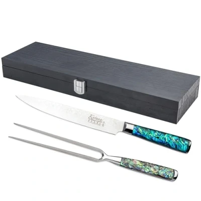 AmazonEXCEPTIONAL DESIGN: Masterfully crafted from Japanese VG-10 Damascus stainless steel with an acrylic handle in a sleek abalone pattern, professionally presented in a dark, hardwood box EXTREME TOUGHNESS: Constructed from 67-layers of the highest quality VG-10 Damascus steel, each Katana Saya knife has a high carbon content ensuring robust edge retention UNPARALLELED SHARPNESS: The Damascus steel blades offer exceptional sharpness for long lasting powerful cutting in the kitchen TOUCH OF ELEGANCE: Choose the vibrant, acrylic handle in abalone pattern, with an ergonomic chestnut shape, for a unique yet elegant design right at home THE CARVING SET: This convenient carving set includes a 20cm (7.9in) carving knife and 18cm (7.1in) carving fork, making serving that Sunday roast both stylish and stress free