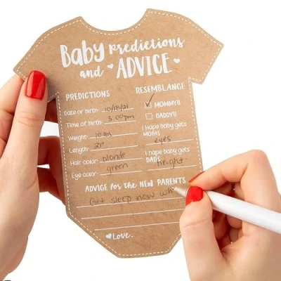 PREDICTION/ADVICE CARDS - On faux kraft paper cardstock cut into a fun onesie shape, white printed text outlines questions and an advice section for baby shower guests to fill out for the new parents. PERFECT KEEPSAKE - Made from a thick and sturdy kraft paper, these advice cards are something you can hold onto, create a book or collage and show your little one as they get older! FUN - Everyone loves to share their opinions and advice, why not make it a game and have a little fun with it! At baby showers it is a great way for friends and family to offer their words of wisdom or to guess things like date, time, who will the baby resemble and more! CONVENIENTLY Sold in sets of 50 Baby Prediction Advice Cards. MEASUREMENTS - Advice card measures 5.25" w x 6" h, Packaged cards measure 5.25" w x 6" h x 0.8" d. Shrink wrap with sticker packaging. Made from sturdy cardstock.