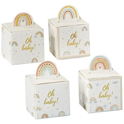 ADORABLE AND DECORATIVE - The Boho Rainbow Baby Favor Box feature 4 different designs, including 6 of each design to create a full set of 24 boxes. Each favor box includes a watercolor rainbow that pops through the top of the box, with watercolor rainbows scattered on each side of the box. Each paper favor box features a gold foil "Oh Baby!" on the front of the box. These 24 paper favor boxes are shipped safely in a cellophane bag. PARTY FAVORS - Greet your guests or send them home with Kate Aspen Boho Rainbow favor box filled with Candies, popcorn, goodies or other small gifts. Your guests will love these gift boxes featuring four different rainbows, each adorned with watercolor rainbows sand saying "Oh Baby". These boxes are easy to assemble and perfect for holding small treats. Display them near your guest book or on your Boho Rainbow Baby themed tablescape to ensure each guest receives one. PERFECT FAVOR OR DECORATION - Great for baby showers or children's birthday parties. Kate Aspen's Boho Rainbow Baby Favor Boxes (Set of 24) are the perfect gift boxes for your party favors at your woodlands theme baby shower. Fill these Rustic baby shower decorations with little bites of chocolate, cookies or candies for a sweet treat. The boxes are assorted with six different adorable woodland animals atop. MEASUREMENTS - favor box measures: 2. 4" W x 2. 4" H x 2. 4" D; packaged product measures 5" W x 7. 25" H x 0. 5" D. CONVENIENTLY sold in set of 24.