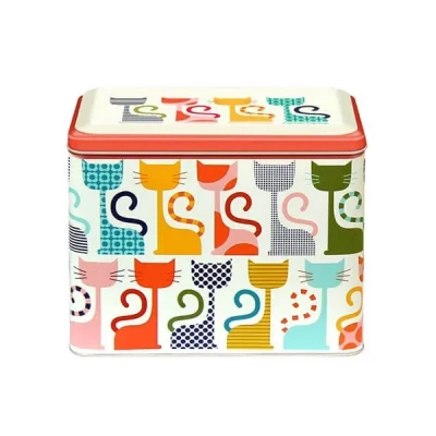 CHARMING DESIGN: Features a delightful Kate Rhees cats pattern with colourful, retro-style feline illustrations in various patterns and hues on a cream background GENEROUS CAPACITY: Extra large tin caddy measuring 18.7 x 12.7 x 13.9 cm, providing ample storage space for tea, coffee, biscuits, or other kitchen essentials DURABLE CONSTRUCTION: Made from high-quality tin material that ensures long-lasting durability and protects contents from moisture and light VERSATILE STORAGE: Perfect for organising kitchen countertops, pantries, or shelves whilst adding a decorative touch to your home décor CARE INSTRUCTIONS: Hand wash only to preserve the vibrant printed design; not dishwasher or microwave safe