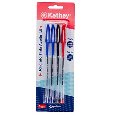 Kathay 86210299 Assorted Pack of 4 Blue, Red and Black Ink Pens, Oil Base, 1 mm Tip, Perfect for your School Supplies Office