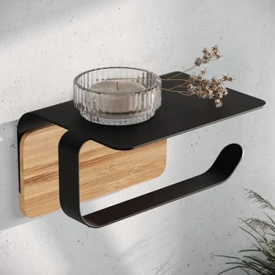 𝗨𝗻𝗶𝗾𝘂𝗲 𝗞𝗔𝗭𝗔𝗜. 𝗗𝗲𝘀𝗶𝗴𝗻: Experience minimalistic Berlin design with 'Leif', a sleek and modern addition to the KAZAI. collection. This wall-mounted toilet roll holder enhances your bathroom decor with its unique style 𝗗𝗿𝗶𝗹𝗹-𝗙𝗿𝗲𝗲 𝗜𝗻𝘀𝘁𝗮𝗹𝗹𝗮𝘁𝗶𝗼𝗻 (𝟯𝗠 𝗧𝗲𝗰𝗵𝗻𝗼𝗹𝗼𝗴𝘆) - 𝗦𝗲𝗹𝗳 𝗔𝗱𝗵𝗲𝘀𝗶𝘃𝗲: Equipped with premium-grade 3M adhesive tape, this toilet paper holder offers exceptional bonding strength for an easy, drill-free setup. Ideal for those seeking a hassle-free installation 𝗛𝗮𝘀𝘀𝗹𝗲-𝗙𝗿𝗲𝗲 𝗦𝗲𝘁-𝗨𝗽 & 𝗥𝗲𝗺𝗼𝘃𝗮𝗹: Clean and dry the surface, peel off the protective layer, and stick on your wooden toilet roll holder. Wait 24 hours for full adhesive strength. Easy to remove without residue 𝗖𝗼𝗻𝘃𝗲𝗻𝗶𝗲𝗻𝘁 𝗦𝗵𝗲𝗹𝗳 𝗙𝗲𝗮𝘁𝘂𝗿𝗲: This bamboo toilet roll holder comes with a shelf that is perfect for safely placing small items like mobile phones, wet wipes, or decorative pieces, combining practicality and style in your bathroom 𝗦𝘁𝗮𝗶𝗻𝗹𝗲𝘀𝘀 𝗦𝘁𝗲𝗲𝗹 𝗮𝗻𝗱 𝗚𝗲𝗻𝘂𝗶𝗻𝗲 𝗪𝗼𝗼𝗱 - 𝗗𝘂𝗿𝗮𝗯𝗹𝗲 𝗮𝗻𝗱 𝗥𝘂𝘀𝘁𝗽𝗿𝗼𝗼𝗳: Crafted from matte, powder-coated, fingerprint-resistant stainless steel and genuine bamboo wood, this durable bathroom accessory is a rustproof and long-lasting solution for your bathroom needs