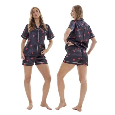 Keanu Ladies Satin Pyjamas Short Sleeve Top with Shorts Silk Pjs Soft Button Down Sleepwear Shorty Set Loungewear Sizes 8 20 (Black Hearts Print, 22)