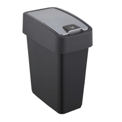 Compact premium waste container with 2-way opening option and 10 l capacity - For waste bags with a volume of 18 - 20 litres Convenient waste disposal: Lid can be hinged upwards and swivelled downwards, Pleasant soft-touch grip surface for ease of use Discreet design with colour-contrasting lid and keeeper trademark integrated in the handle, Easy to clean: Lid can be completely removed, wipe with a damp cloth or sponge Made in Europe, High-quality, stable plastic (PP), No release of harmful substances Scope of delivery: 1 waste bin Magne, dimensions: 29.5 x 18 x 36.5 cm, Weight: 0.551 kg, colour: Graphite, Item no.: 10603826000NN
