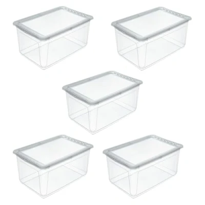 For more order in your household and wardrobe: transparent storage box with optional ventilation function - ideal for storing and sorting summer and winter clothes or sports and play accessories Patented air control system: optionally permanent ventilation or dust protection by rotating the lid by 180 degrees - ideal for shoes and breathable leather or sports goods Safe stacking thanks to raised lid edge, easy to find stowed things through visibility from all sides, bottom parts and lid nestable, mounted boxes stackable on top of each other, click closure on lid tabs Made in Europe: high-quality, sturdy plastic (PP), no release of harmful substances, easy to clean: wipe with a damp cloth or sponge Box contents: 5 storage boxes bea, dimensions (L x W x H): 59 x 39 x 27 cm, capacity: 43 l, colour: transparent, item number: 30258001000ZD, Weight: 11.3317602668 Pounds, Manufacturer: keeeper