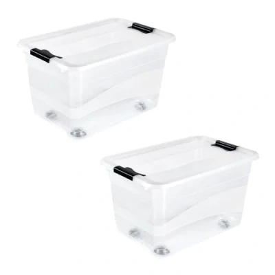 keeeper Konrad 2 x Storage Box with Wheels, Lid and Sliding Closure, 59.5 39.5 35 cm, 52 L, Transparent