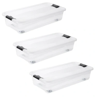 For more order in the household: transparent storage box with lid and wheels - ideal for storing and sorting hobby items, decorations and other small items Quick and easy access to stored things thanks to practical wheels, wheels can be mounted horizontally or lengthwise as desired, reliable closing thanks to sturdy lid with side sliding closures Easy to find stowed things through visibility from all sides, safe stacking thanks to raised lid edge, lower parts and lid nesting inside each other to save space, mounted boxes stackable on top of each other Made in Europe, high-quality, sturdy plastic (PP), no release of harmful substances, easy to clean: wipe with a damp cloth or sponge Box contents: 3 storage boxes with wheels konrad, dimensions (L x W x H): 79.5 x 39.5 x 18 cm, capacity: 33 l, colour: transparent, item number: 30244001000ZD