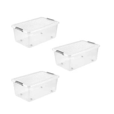 keeeper Leo 3 x Storage Box with Lid and Wheels, 37 L, 59 38 24 cm, Clip Box, Transparent