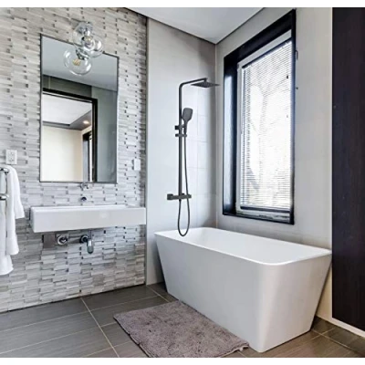 Keenware premium square thermostatic shower system; Black 200mm overhead shower head 3 function push button control shower handset with 1.5m shower hose Adjustable shower rail; 870-1240mm Fully thermostatic brass bar shower valve, 38° degree anti scald device & hot & Cold fail safe§ ¾” inlets for both hot & Cold connection & easy fit Kit included Recommended 1bar minimum for best performance, Compatible with all standard UK water systems, Manufacturer: Keenware