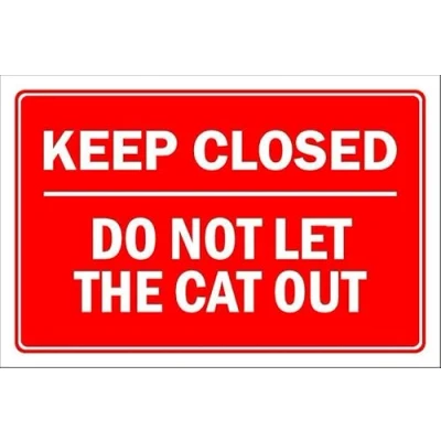 Keep closed do not let the cat out. Self adhesive sticker. Printed using the latest digital technology and laminated for extra durability. Remove backing film and apply to dry, smooth, oil free surface. All signs come with a 5-year warranty. All our signs are UV resistant meaning they will not fade in sunlight. Our vinyl stickers are temperature resistant from -40°C to +80°C.