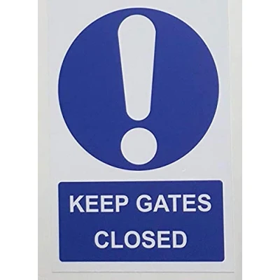 Keep gates closed sign Self adhesive sticker 200mm x 150mm Remove backing film and apply to dry, smooth, oil free surface. Digitally printed and laminated for extra durabillity