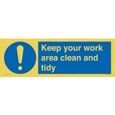 M001 : General mandatory action This sign is made from vinyl gold sticker Gold metal effect sticker for flat, clean surfaces. Not for rough, plastic, or dusty surfaces. 62 landscape Sign Text: Keep your work area clean and tidy