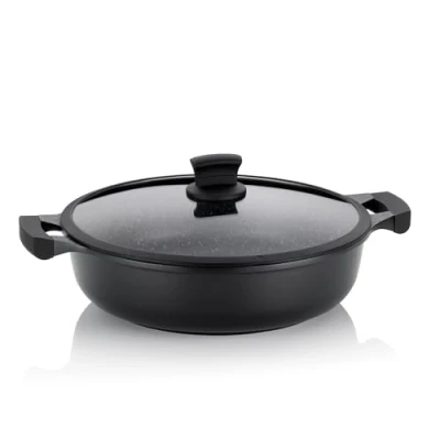 The STELLA NOVA cast aluminium serving pan with high rim makes preparing tasty dishes a pleasure: Frying, simmering or braising - the pan offers plenty of space for larger quantities of all your favourite dishes With its excellent heat retention and even heat distribution, the frying pan is suitable for the healthy and energy-efficient preparation of crispy vegetables, stews, meat and fish The 3-layer non-stick coating ensures vitamin-preserving cooking and promotes the development of the roasting flavours. The specially structured surface of the Oil Control System ensures even oil distribution The full-surface, induction-compatible stainless steel base ensures short heating times and additional energy savings - suitable for gas, glass ceramic, electric and induction. The soft-touch handles provide a secure grip Scope of delivery: 1x 32 cm serving pan with glass lid (height 9 cm, 5 L, base ∅ 23.5 cm) STELLA NOVA (item no. 12226), material: coated cast aluminium, heat-resistant up to 180°C