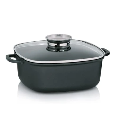 Preparing tasty dishes becomes a pleasure in several steps with the KERROS square serving pan, as there is no need for decanting: cooking, gratinating in the oven and serving - all directly in one pan The flavour knob in the lid can be used to refine the flavour of the food by slowly draining off wine or stock. The braising pan is suitable for all hob types: Gas, glass ceramic, electric and induction Thanks to the ceramic-reinforced GREBLONnon-stick coating, the use of oil and frying fat in the braising pancan be greatly reducedfor healthier and nutrient-preserving cooking and nothing burns kela, a medium-sized company with 120 years of tradition, at home in the Swabian Alb. A large selection of high-quality products for the kitchen and bathroom to make you feel at home Scope of delivery: 1x serving pan 28 x 28 cm (H 11 cm, 6 L, base dimensions 21 cm) with glass lid KERROS (item no. 11553), material: ceramic-coated cast aluminium, heat-resistant glass, ovenproof up to 230 °C (with lid up to 180 °C)