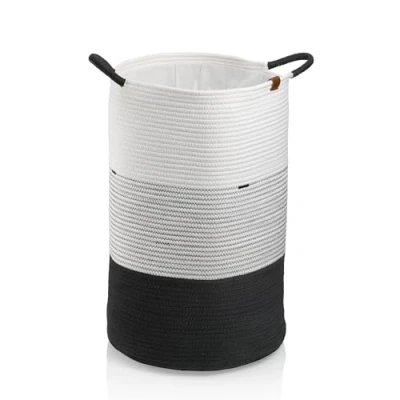 Stylish storage: the HEDDA laundry box made of polyester-cotton blended fabric allows dirty laundry to be collected in a well-ventilated area, offers sufficient space and is also suitable as a storage basket for blankets, toys and much more. Natural materials such as cotton are permeable to air and regulate moisture. This prevents the proliferation of bacteria and germs in damp clothing and the development of unpleasant odours The laundry box keeps its shape and stands upright without buckling. A fabric insert allows the laundry bag to be closed. Two carrying straps make it easy to transport kela, a medium-sized company with 120 years of tradition, at home in the Swabian Alb. A large selection of high-quality products for the kitchen and bathroom to make you feel at home Scope of delivery: 1x black and white woven laundry basket with handles (item no. 24453), dimensions Ø 40 x H 57 cm. Easy to clean with a hoover
