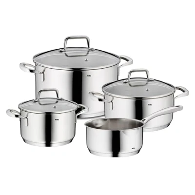 The 4-piece FLAVORIA saucepan set made of stainless steel with a glossy finish is versatile and covers a wide range of cooking needs, from small dishes to larger meals, with its different pot sizes and functions Thanks to optimum heat distribution and durable materials, dishes are particularly tender and full of flavour. The energy-saving base of the saucepan also ensures perfect grip The internal scaling offers precise dosing of liquids without an additional measuring jug - less decanting and remeasuring is necessary. The ergonomic stainless steel handles provide a secure grip and the pouring rim ensures drip-free pouring The stainless steel cooking pots are suitable for gas, oven, glass ceramic, electric and induction hobs. The glass lid with outlet valve prevents excessive pressure build-up and protects against boiling over (heat-resistant up to 180°C) Scope of delivery: 3x saucepan 20 cm (2.4 L), 16 cm (1.6 L), 24 cm (5.5 L) with lid, 1x saucepan without lid 16 cm (1.3 L) FLAVORIA (art. no. 10201), material: 18/10 stainless steel, heat-resistant glass, ovenproof up to 220°C. Dishwasher safe, Weight: 11.5963149812 Pounds, Manufacturer: Kela