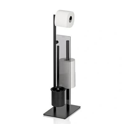 3in1: the modern STYLE toilet set made of powder-coated metal (matt) with toilet brush holder, paper roll holder and spare roll holder combines functionality with a simple design and scores with its flexibility The standing toilet brush set (with stainless steel handle and replaceable LA BROSSE brush head) and toilet paper are always stored neatly and hygienically. The tinted glass disc provides visual separation from the 3 spare rolls The stable base plate with rubberised underside ensures optimum stability and prevents tipping or wobbling. This means it can be placed in any desired location in the bathroom kela, a medium-sized company with 120 years of tradition, at home in the Swabian Alb. A large selection of high-quality products for the kitchen and bathroom to make you feel at home Scope of delivery: 1x toilet brush set STYLE black matt (item no. 22499), dimensions L 26 x W 18 x H 71 cm. Easy to clean thanks to removable stainless steel container. Available in silver and black